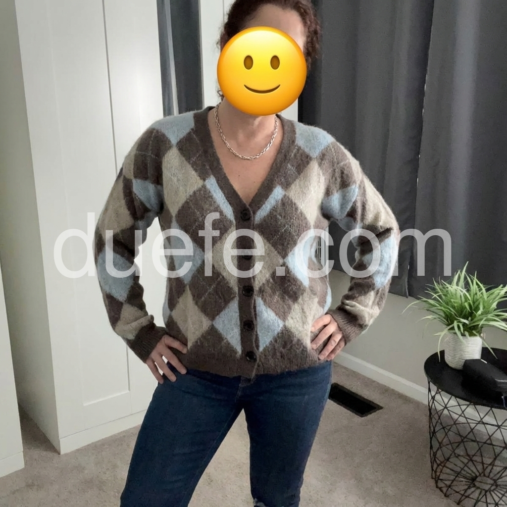 This cardigan features a timeless argyle geometric print in versatile neutral tones, offering a sophisticated layering option. Crafted with a button-front design, it allows easy wear and adjustable styling. Its refined pattern blends classic and contemporary elements, making it an ideal choice for enhancing both casual and polished outfits with subtle texture and depth.