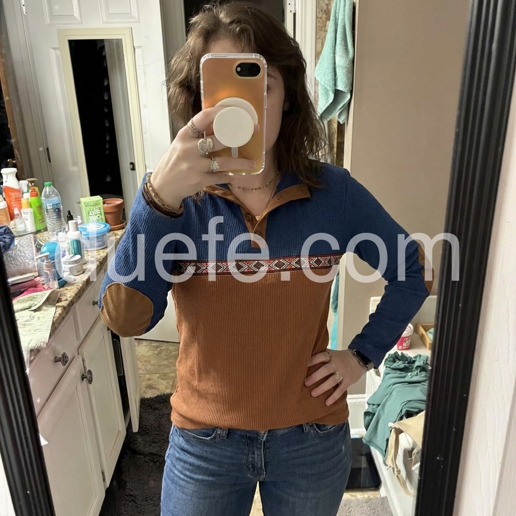 Elevate your casual wardrobe with this sophisticated brown long sleeve top, featuring contrasting color block panels that add visual interest and dimension. The signature elbow patches deliver timeless preppy appeal while reinforcing high-wear areas for enhanced durability. Crafted for versatility, this piece transitions seamlessly from weekend errands to relaxed office settings. The structured long sleeves provide coverage and warmth, making it an ideal layering piece for transitional seasons. A refined choice for those who appreciate understated style with functional design details.