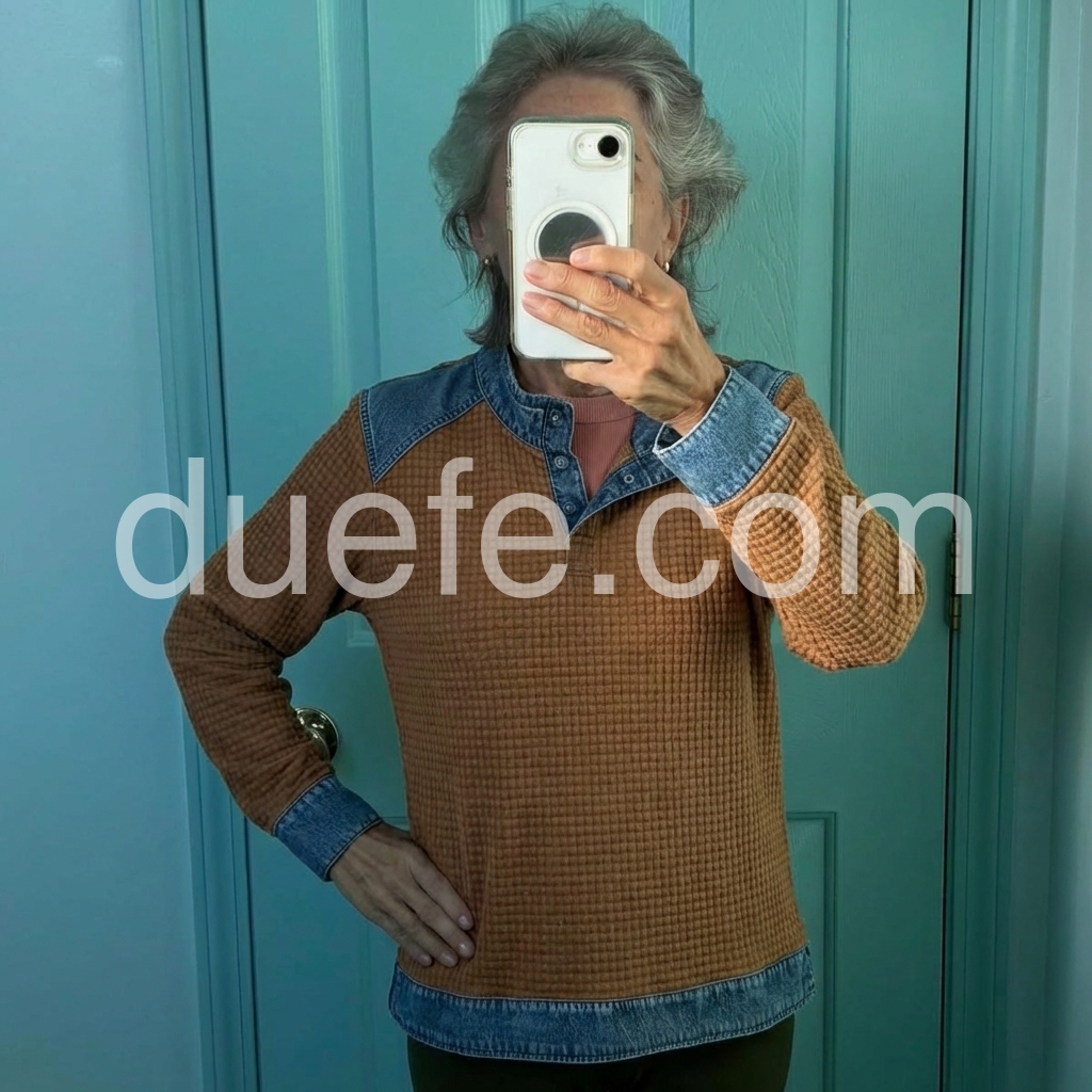 Crafted from premium denim, this long sleeve top features a sophisticated brown color block design that adds visual interest and versatility to your wardrobe. The structured fabric provides durability and maintains its shape through regular wear, while the extended sleeves offer practical coverage. The color blocking technique creates a modern silhouette that works seamlessly with both casual and elevated styling. Perfect for layering or wearing as a standalone piece, this top delivers timeless appeal with contemporary flair.