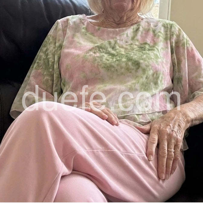 I am so pleased with this purchase. The elastic waist on the wide leg pants makes them so comfortable to wear for hours. The green and pink pattern is just lovely for spring.