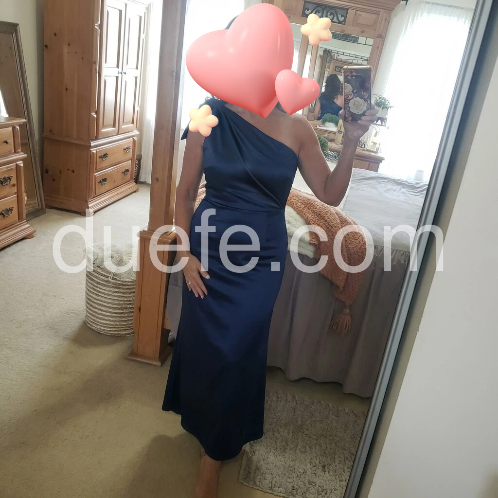 Love this dress! The color is beautiful, and the one-shoulder design looks so elegant. The fit is flattering and the slit makes it easy to walk in. Great quality and looks exactly like the photos.