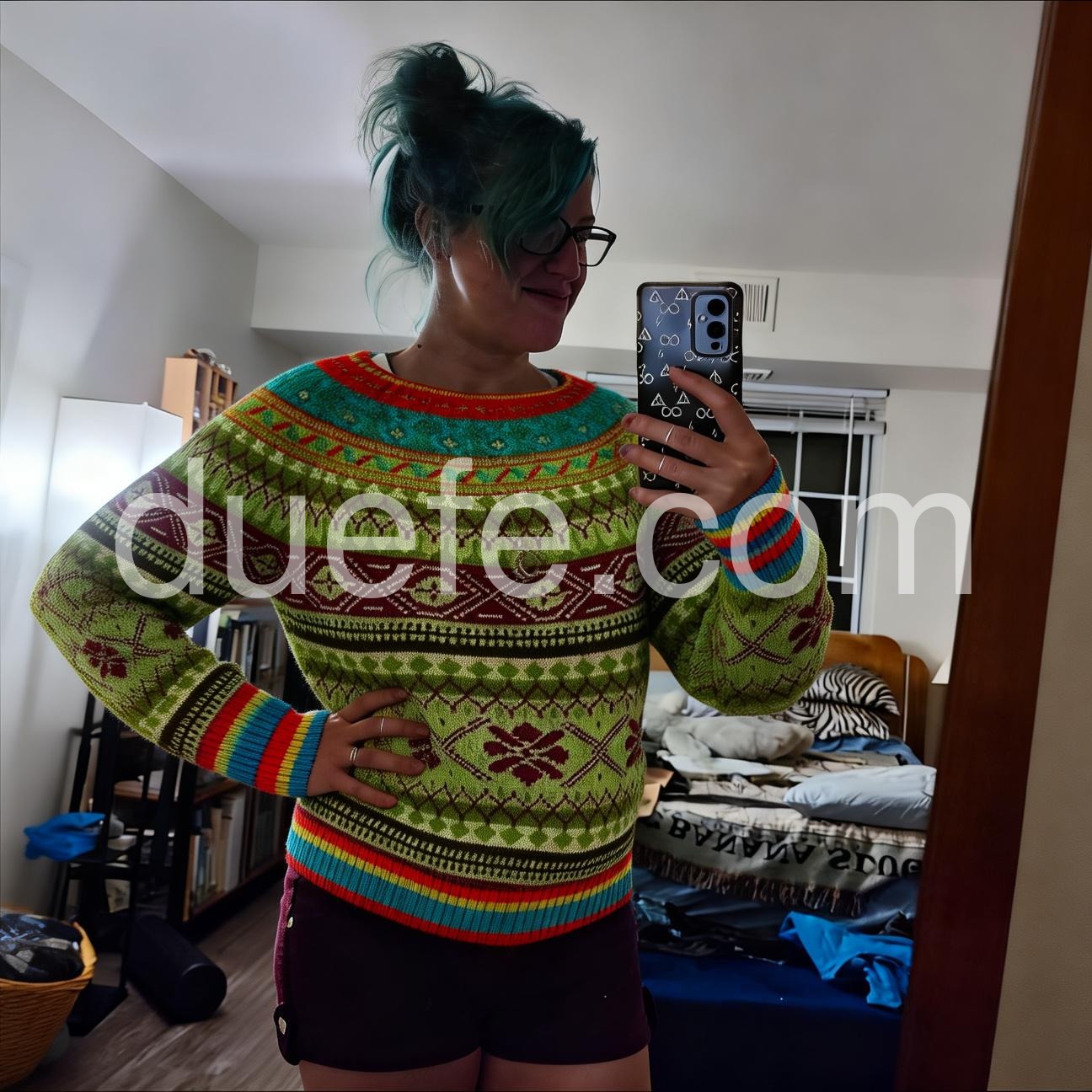 Steal the spotlight in this unique sweater knit in bright shades and a bold stripy pattern. The cozy style has a relaxed fit and pulls on with a wide neckline that shows off your collarbone. Style it with faded straight-leg jeans and combat boots for a 90s-vibe look.
