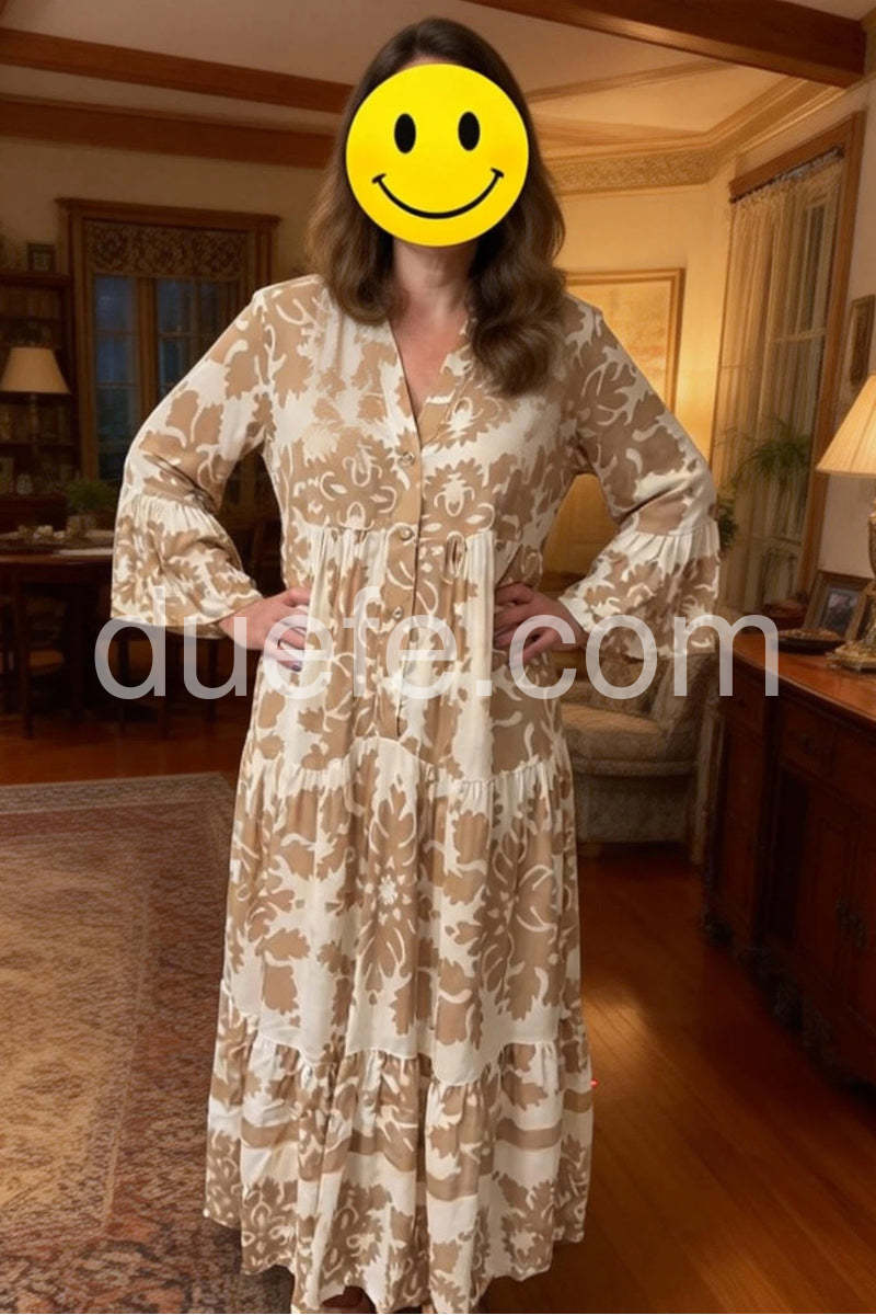 This elegant maxi dress features an attractive v-neck and 3/4 sleeves, making it a versatile and stylish addition to any wardrobe. The timeless design and flattering silhouette make it perfect for any occasion. Crafted with high-quality materials, it provides both comfort and style.