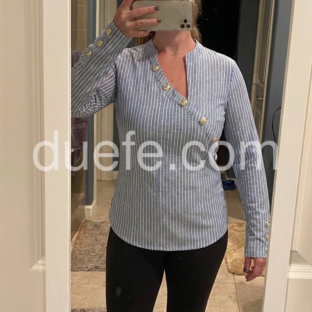 I absolutely love this striped blouse! The asymmetrical button detail gives it such a unique and chic look for the office. It fits perfectly and pairs wonderfully with my white dress pants.