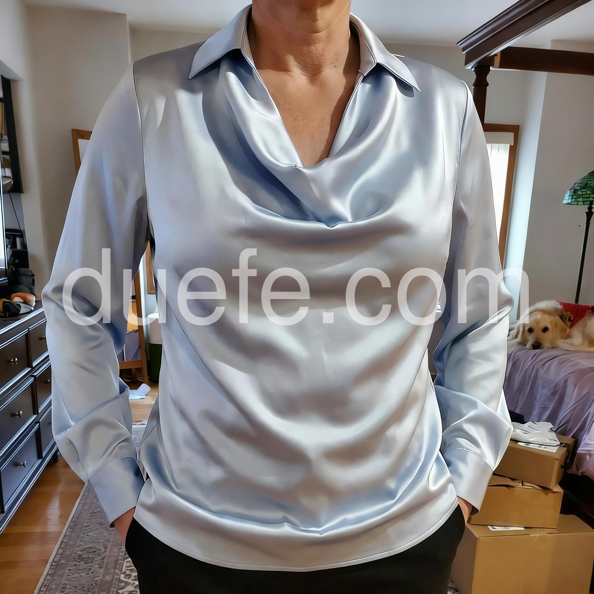 This blouse is absolutely stunning! The silky material feels incredibly luxurious and it drapes beautifully. I wore it to the office and received so many compliments. It looks much more expensive than it is.
