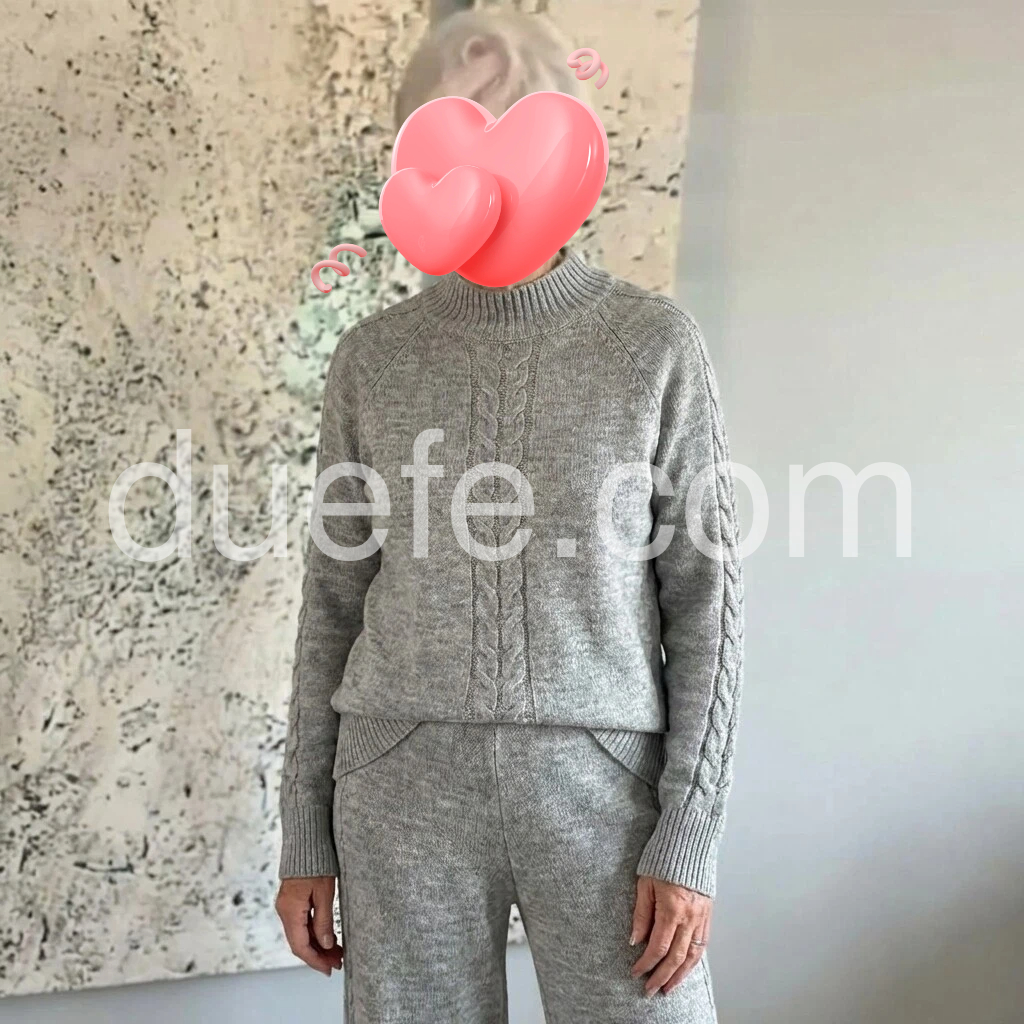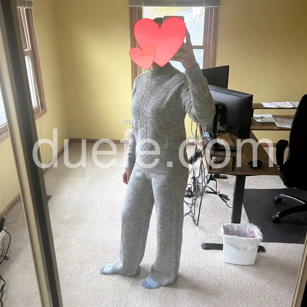 I love this set! The gray knit is soft and warm, and the cable detail on the sweater looks really nice. The pants fit comfortably and the whole outfit has a flattering, relaxed look. It’s perfect for staying in but still looks put together. Looks exactly like the photos and feels well made.