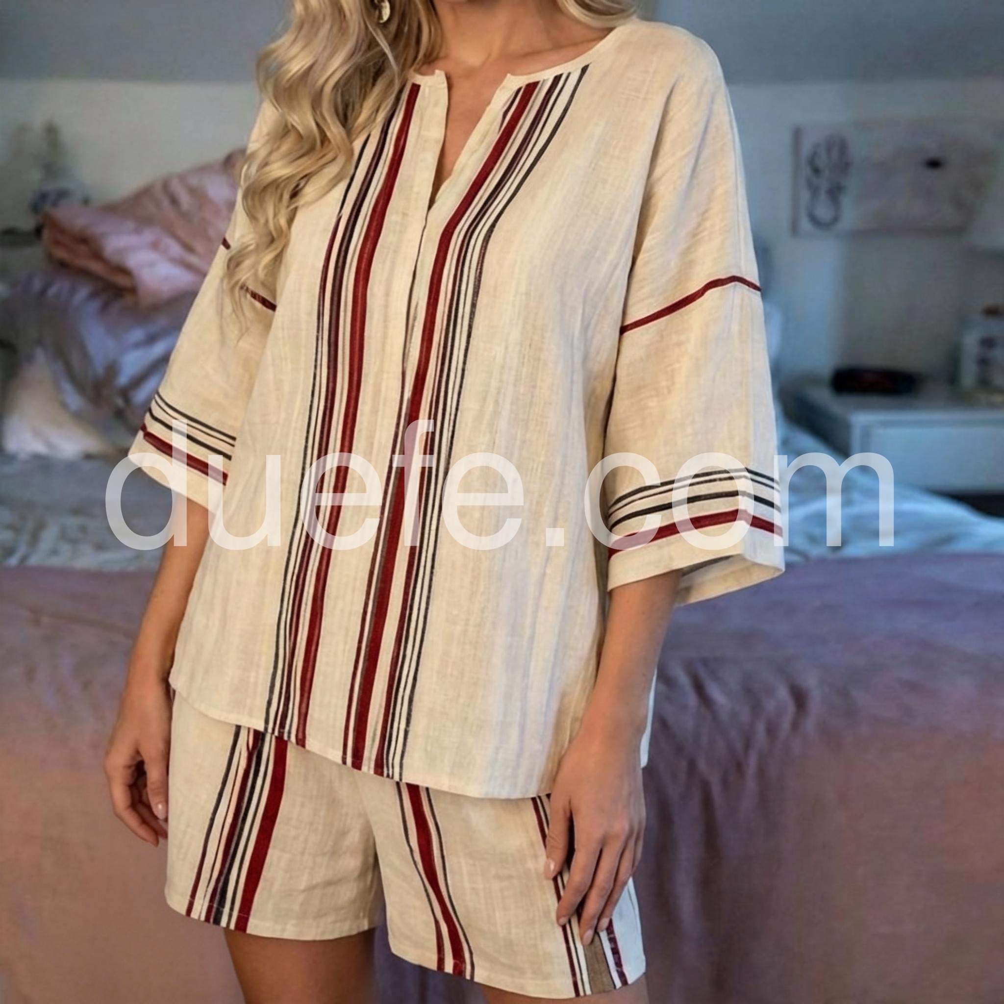 This sophisticated two-piece set features a flattering V-neck design complemented by classic striped patterns. Engineered for optimal comfort without sacrificing style, the coordinated pieces offer versatile styling options for various occasions. The thoughtfully constructed silhouette provides a polished appearance while maintaining ease of movement throughout the day.