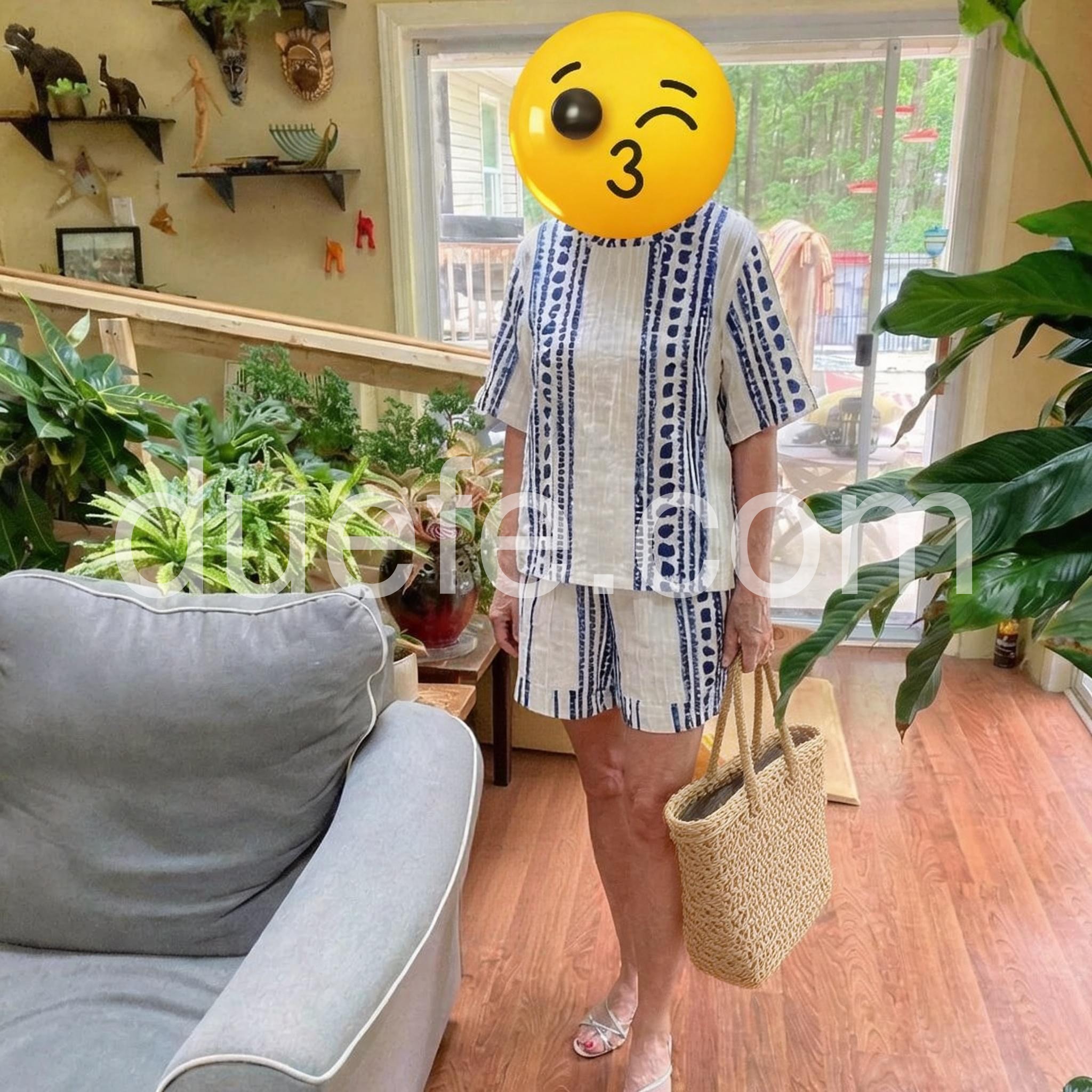 This matching set is absolutely delightful. The white and blue stripes look fresh and crisp, and the fabric feels light and breathableerfect for warm days. The fit is true to size, and the relaxed short silhouette is flattering and comfortable. The straw bag adds a perfect, tropical touch that ties the whole look together. Customer service was responsive, and delivery was quick, making the shopping experience smooth from start to finish. Highly recommend for a chic, effortless summer outfit.
