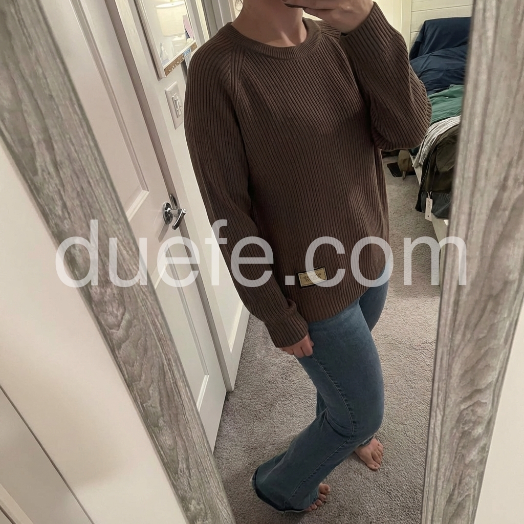 This dark brown ribbed sweater is such a wardrobe staple! I love the little \"Original Fashion\" patch detail—it gives it a casual, trendy vibe. The relaxed fit is flattering, and it pairs perfectly with jeans for everyday wear. It’s warm enough for cool days and lightweight enough for layering. I’ve gotten so many compliments already!