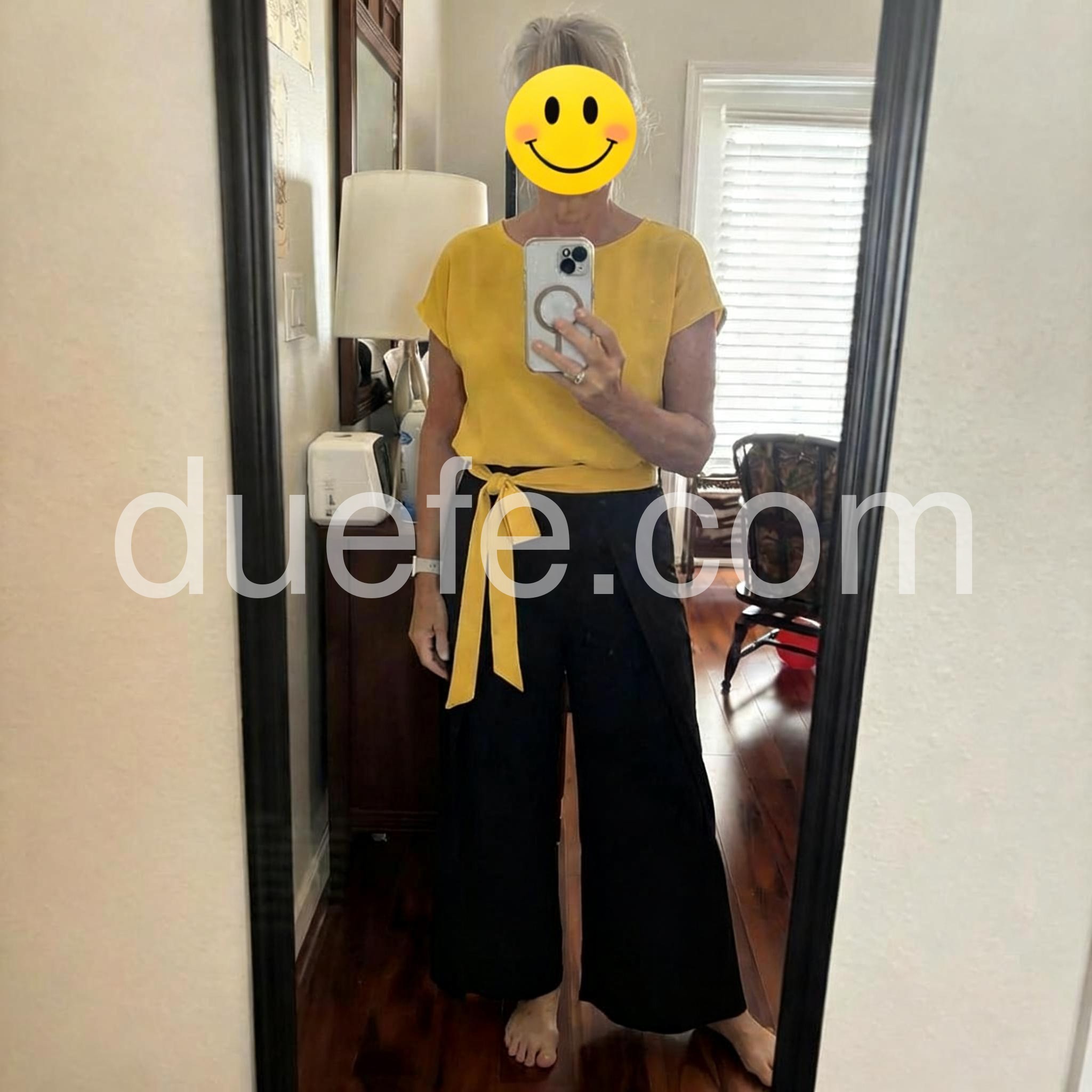 Love the bold color combo! The mustard-yellow top is airy and flattering, and the wide-leg black pants with the yellow waist tie create a chic, modern silhouette. Perfect for casual days out.